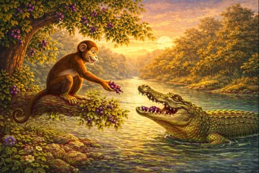 She demanded that her husband bring the monkey’s heart to her. The crocodile was deeply disturbed. He valued his friendship with the monkey and did not want to harm him. But his wife refused to eat or speak until her demand was fulfilled. Confused and pressured, the crocodile finally agreed to a terrible plan.
