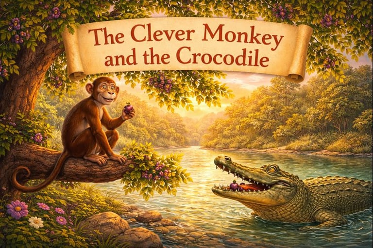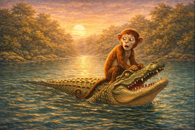 The monkey, safe and proud of his presence of mind, decided never to trust blindly again. The crocodile swam away, carrying the weight of his mistake forever.