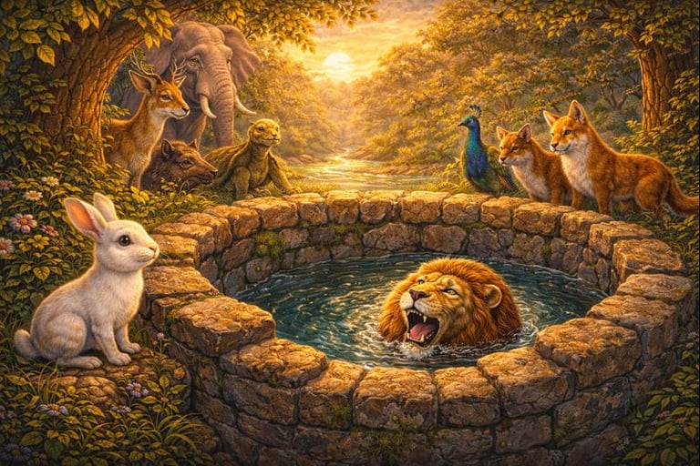 The rabbit led the lion through the forest to an old deep well filled with clear water. Peering inside, the lion saw his own reflection in the water, along with the echo of his roar.